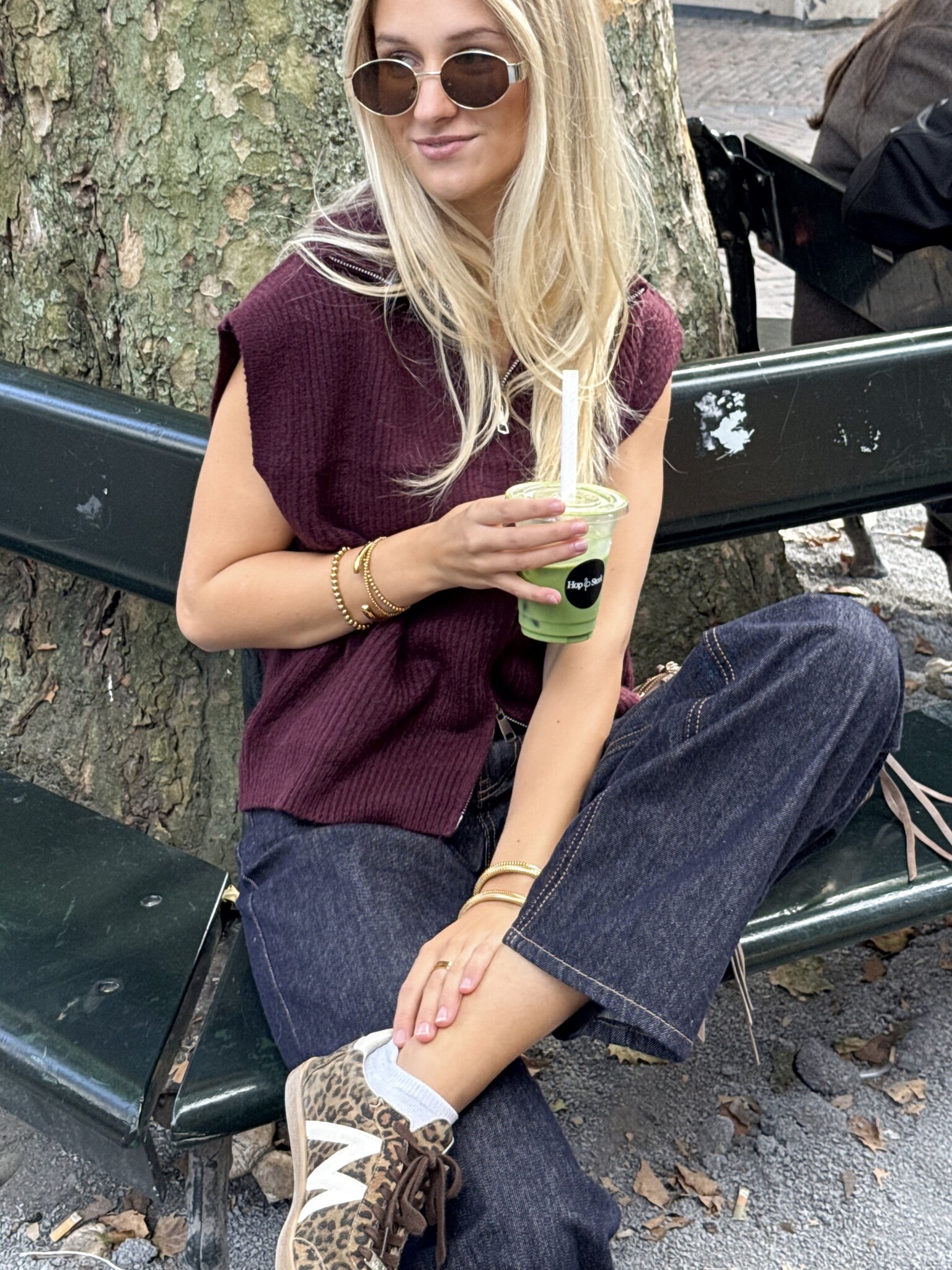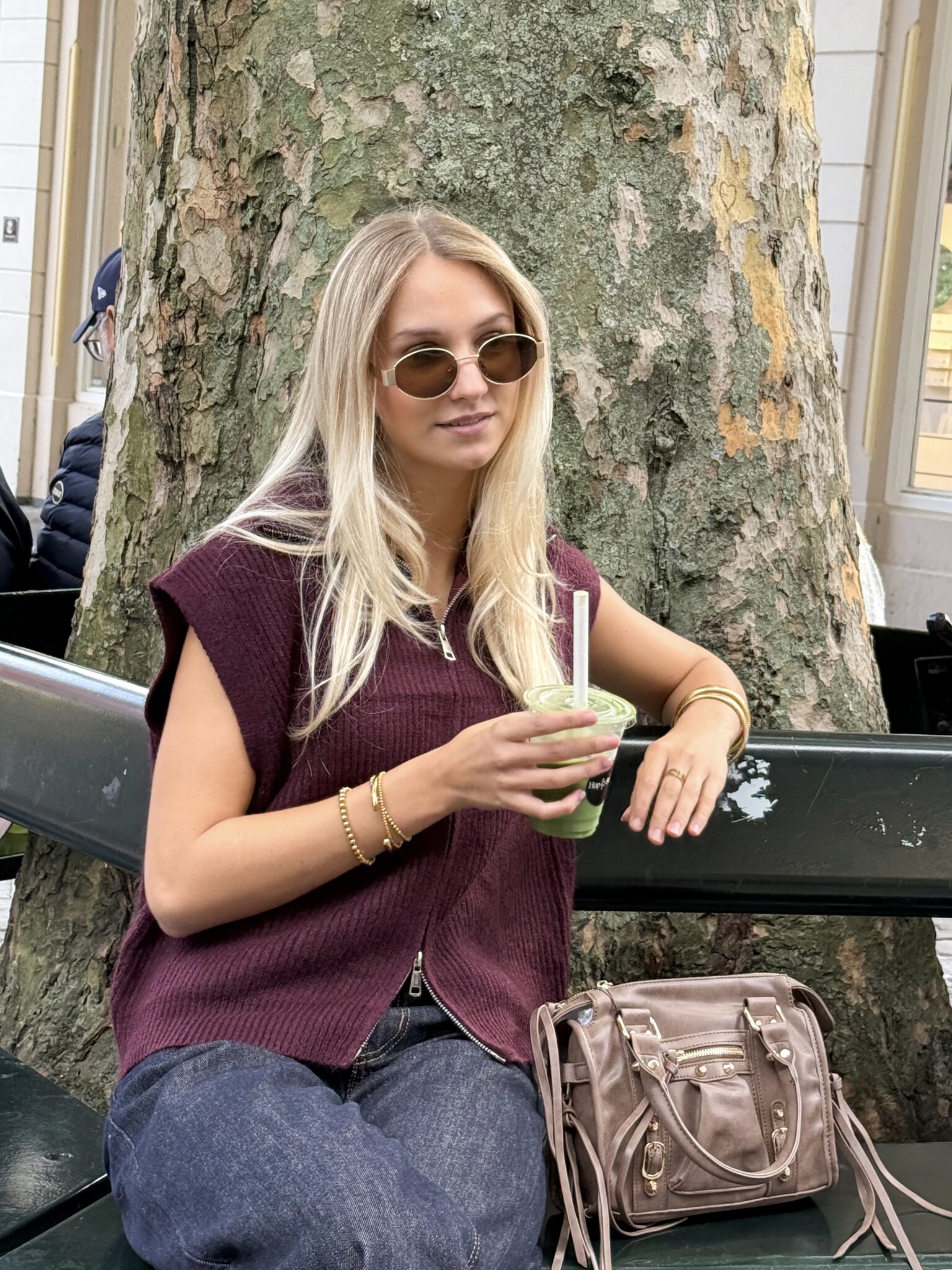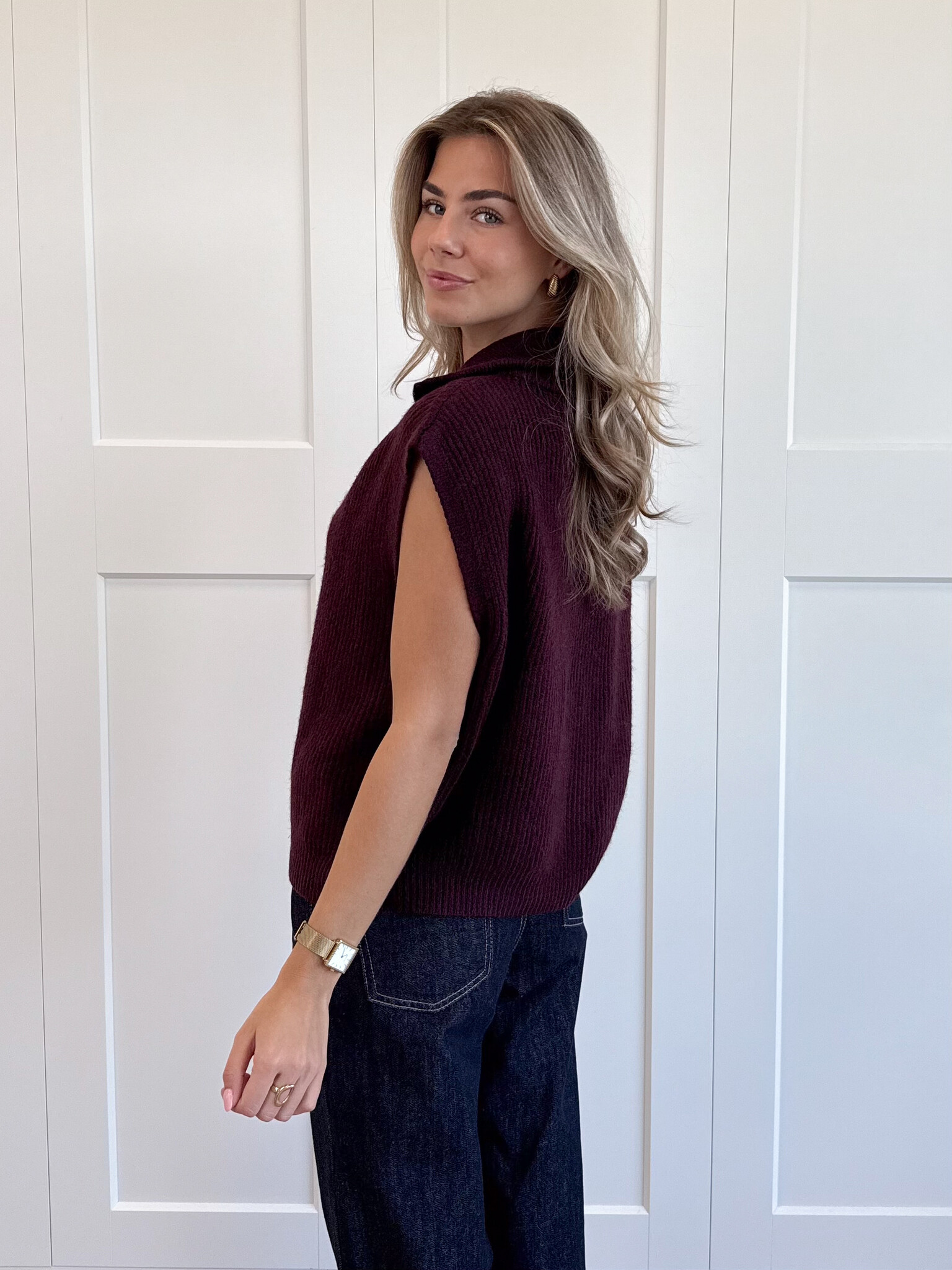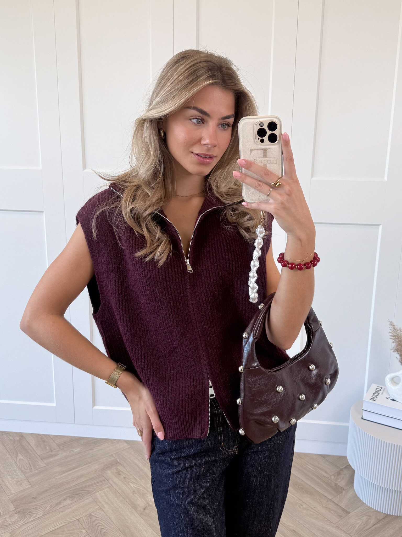 Maak kennis met dit bordeaux knit gilet. Een echte musthave voor jouw herfst- en wintergarderobe. Gemaakt van een zachte ribstof die heerlijk draagt, en afgewerkt met een kraag voor een stoere touch. De oversized fit geeft een relaxte uitstraling, terwijl de rits zowel van boven als onder open te maken is, zodat je haar op verschillende manieren kunt stylen. Draag het gilet over een longsleeve of blouse voor een gelaagde, cozy look.
