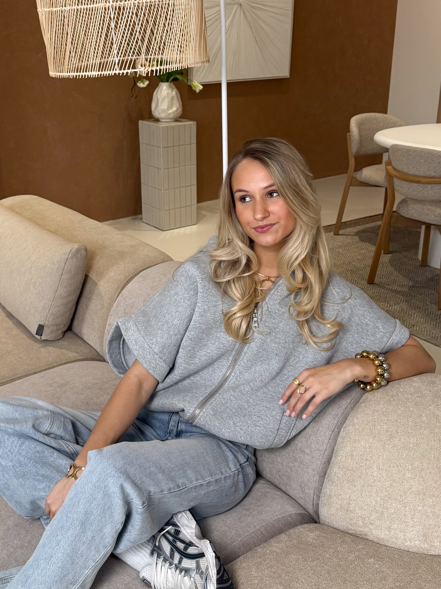 Meet je nieuwe go-to voor relaxte days! Dit grijze korte-mouwen zippervest is oversized voor een comfy fit en heeft een zachte, warme stof die je heerlijk omhult. De capuchon voegt een casual, sporty touch toe, terwijl de handige zakken perfect zijn voor je telefoon of lipgloss. Dankzij de korte mouwen kun je het vest makkelijk layeren over tops of hoodies en het is ideaal voor alles van festivals tot lazy weekend vibes. Een must-have item dat stijl en comfort moeiteloos combineert en je outfit instant een chill, trendy vibe geeft.