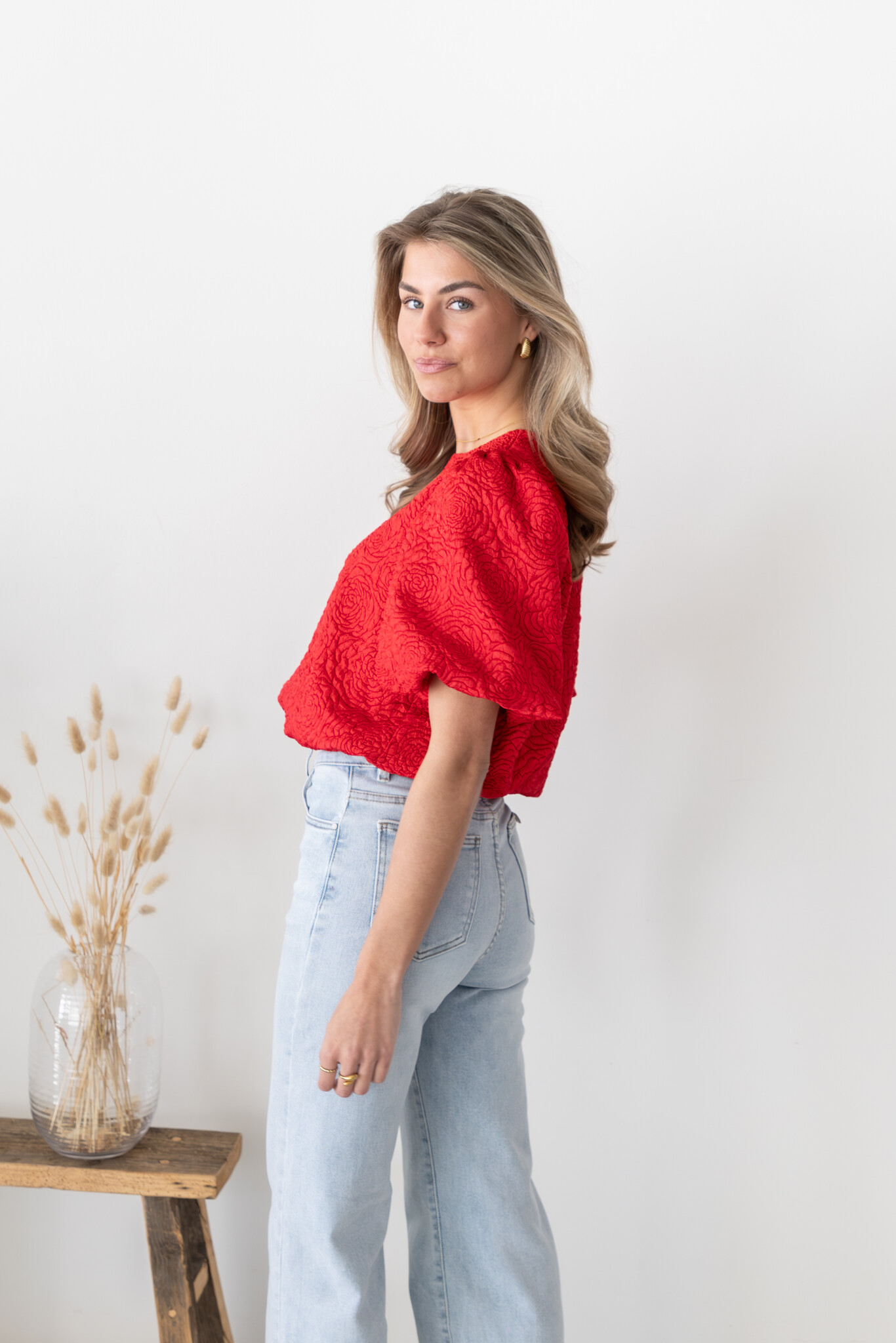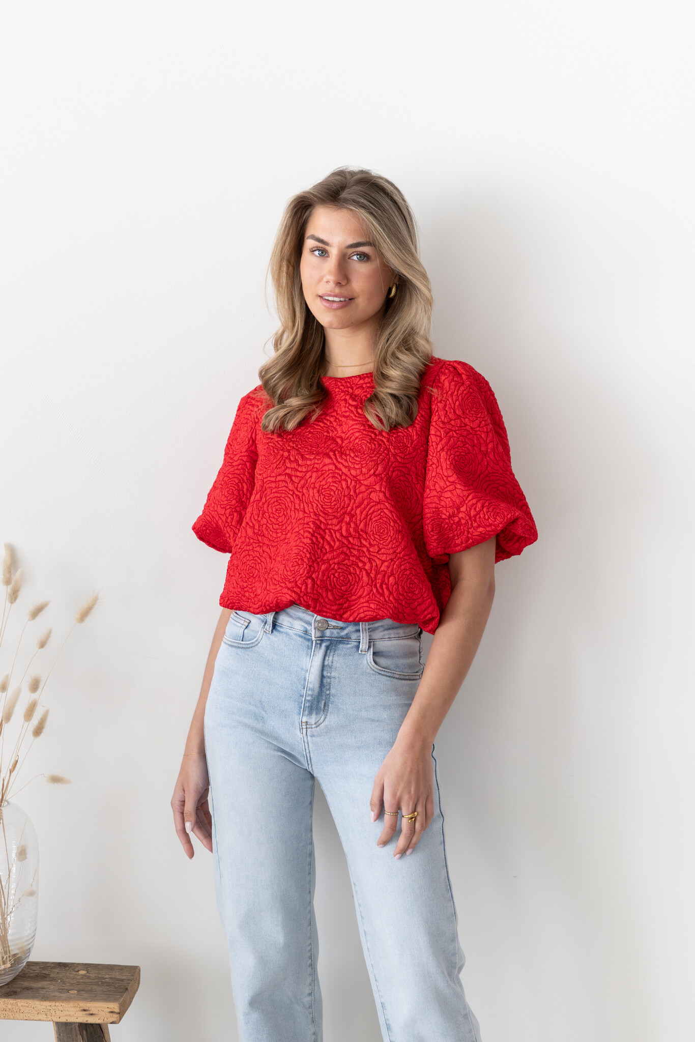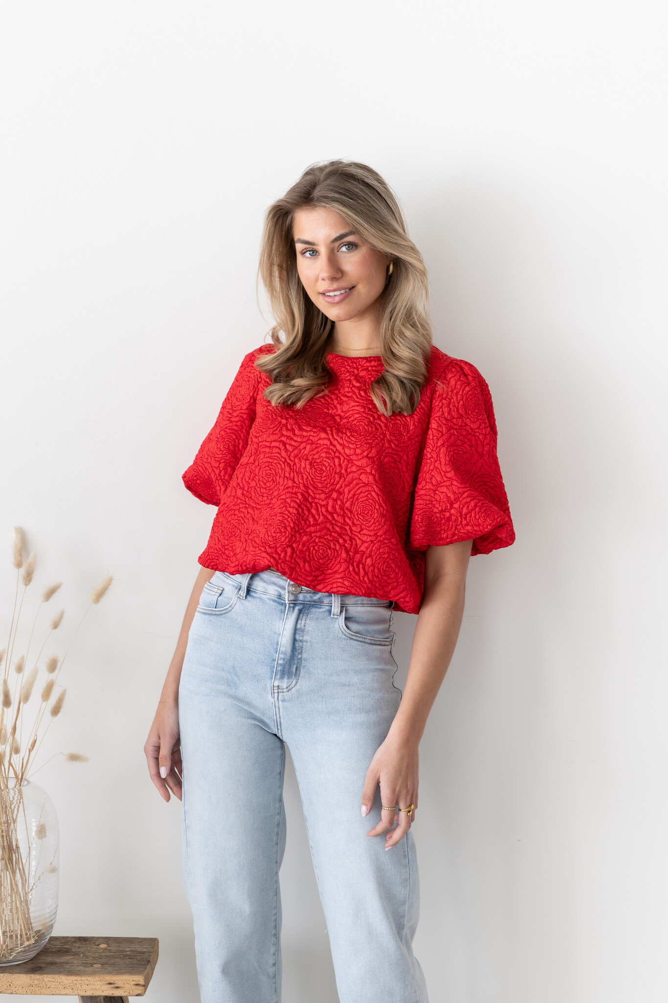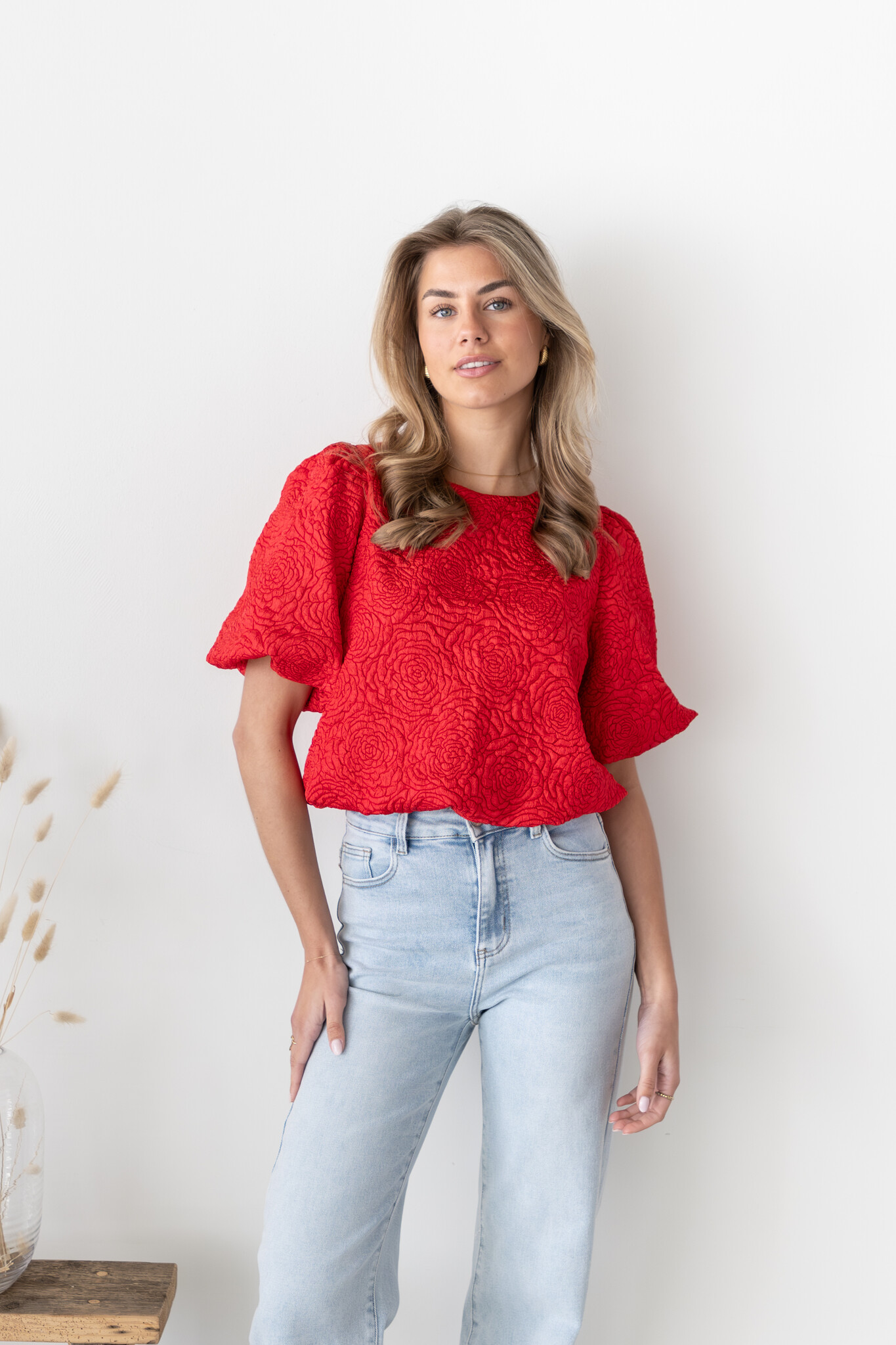 SPRING INTO STYLE - Rosy musthave! Onze Mira top heeft een bloemenstructuur en pofmouwtjes. Het is een cropped model met een elastieke band aan de onderkant, waardoor het een ballon-effect heeft. Makkelijk te combineren met een van onze lichte jeans.