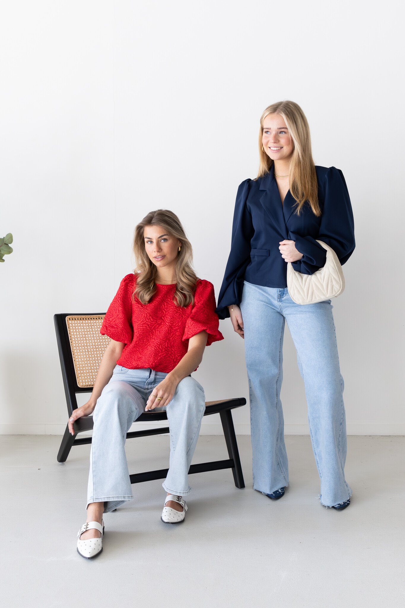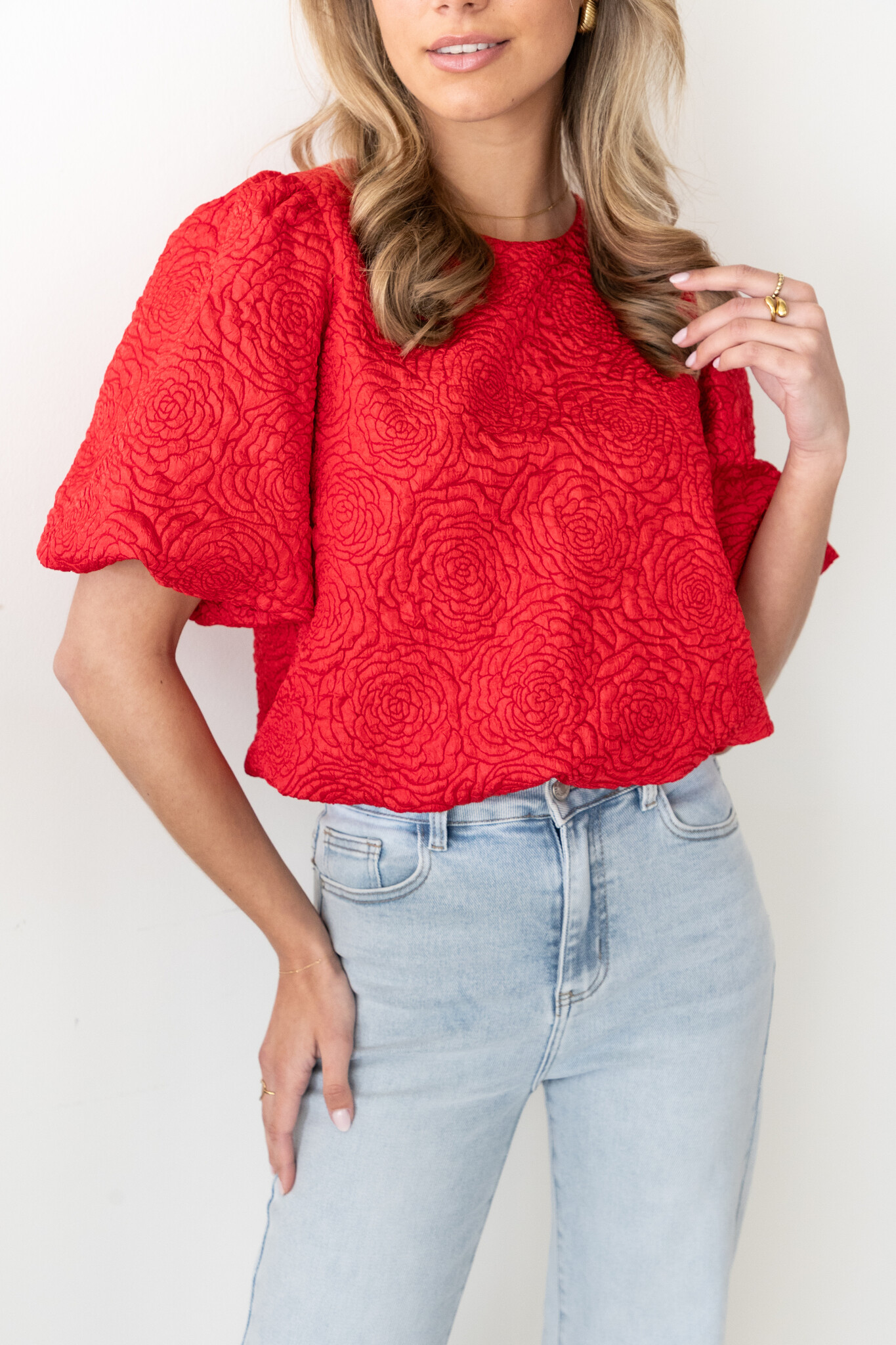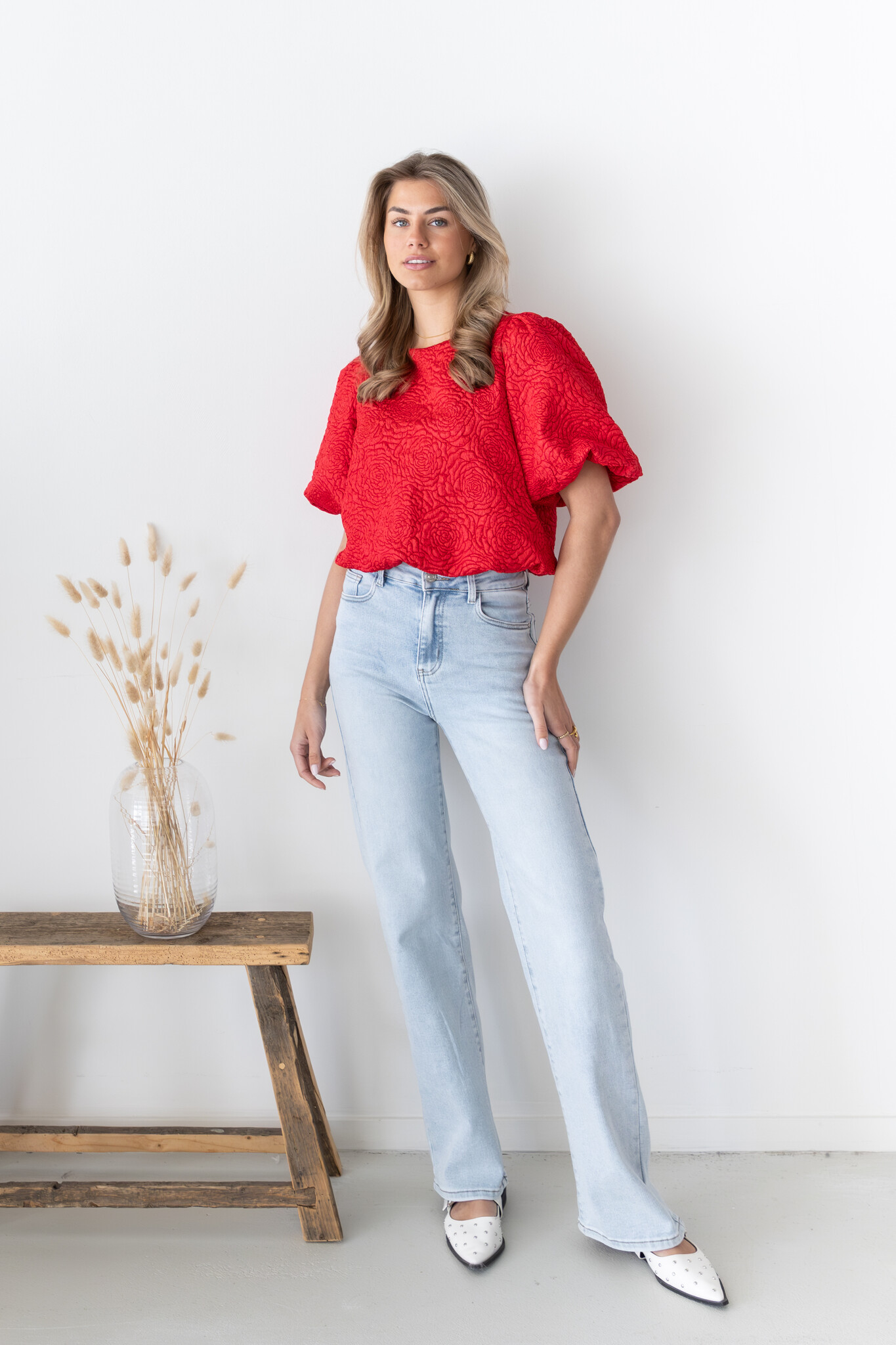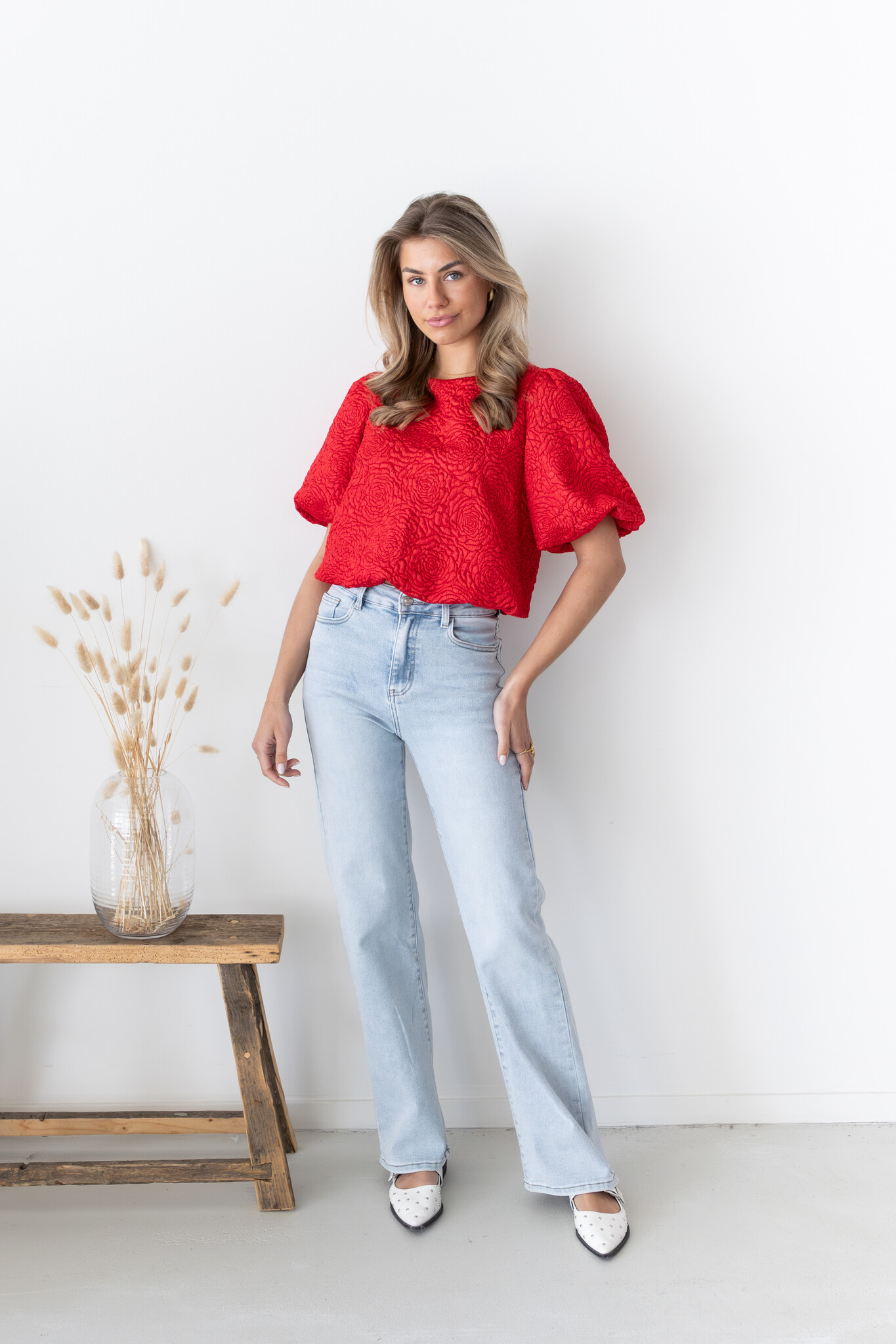 SPRING INTO STYLE - Rosy musthave! Onze Mira top heeft een bloemenstructuur en pofmouwtjes. Het is een cropped model met een elastieke band aan de onderkant, waardoor het een ballon-effect heeft. Makkelijk te combineren met een van onze lichte jeans.